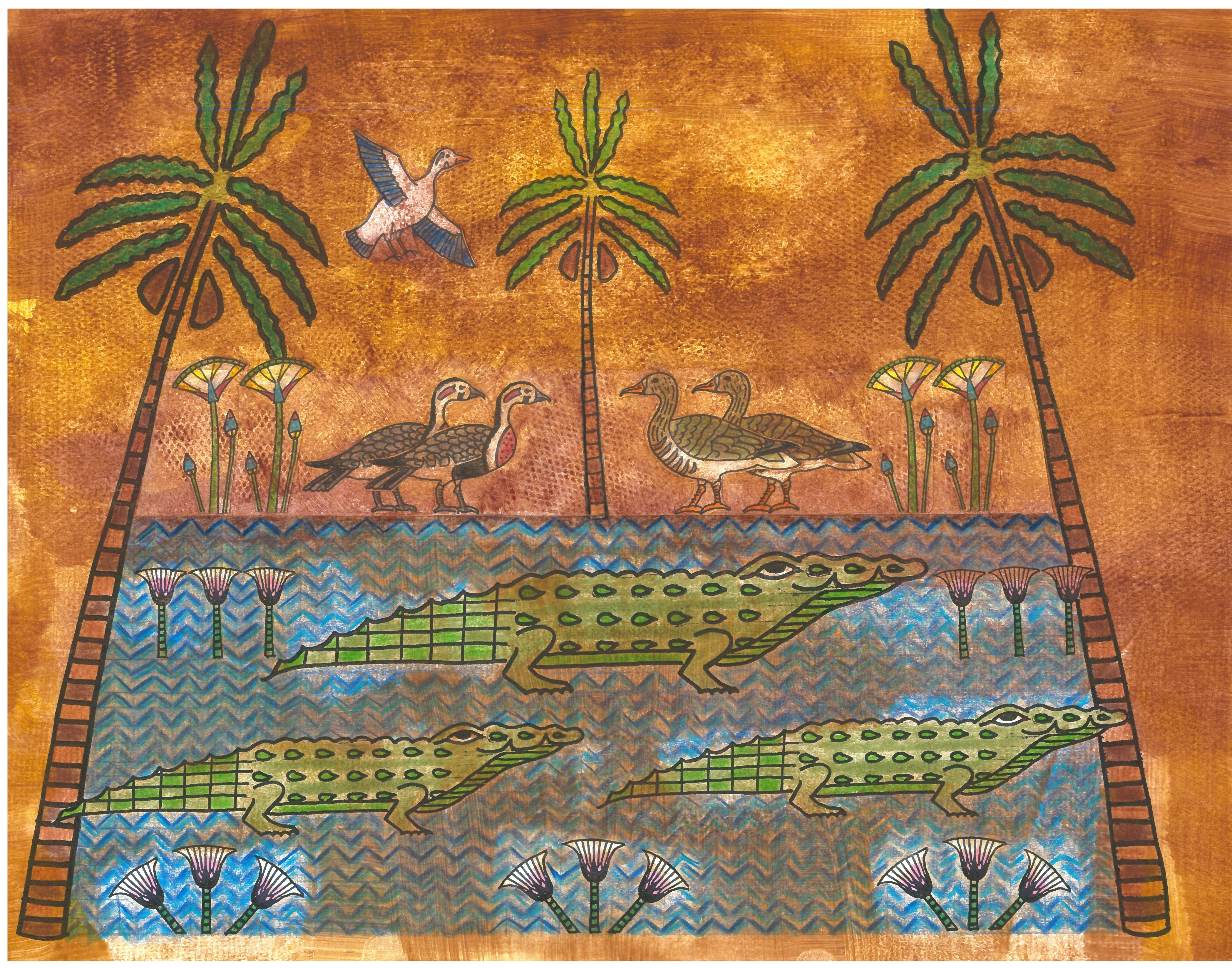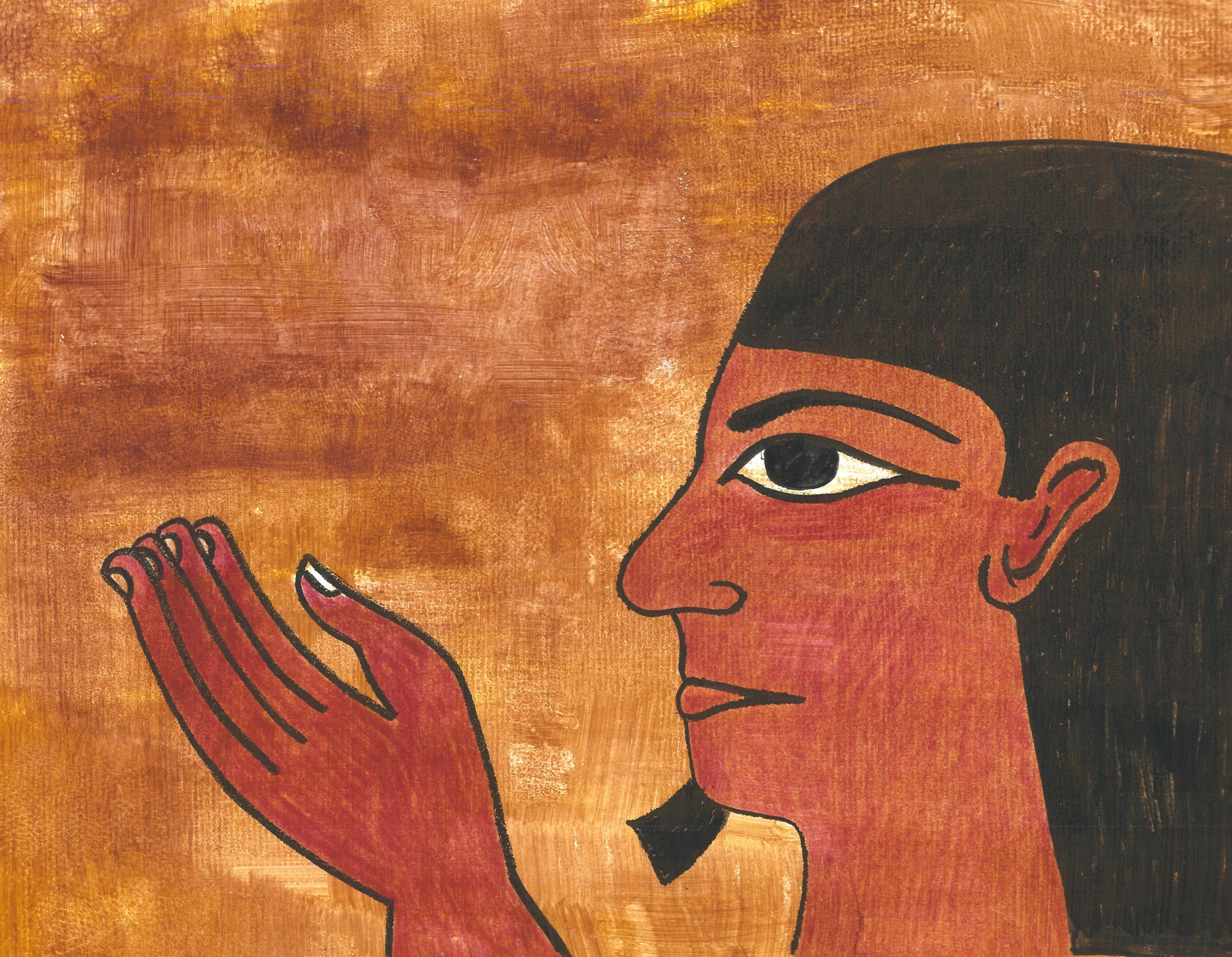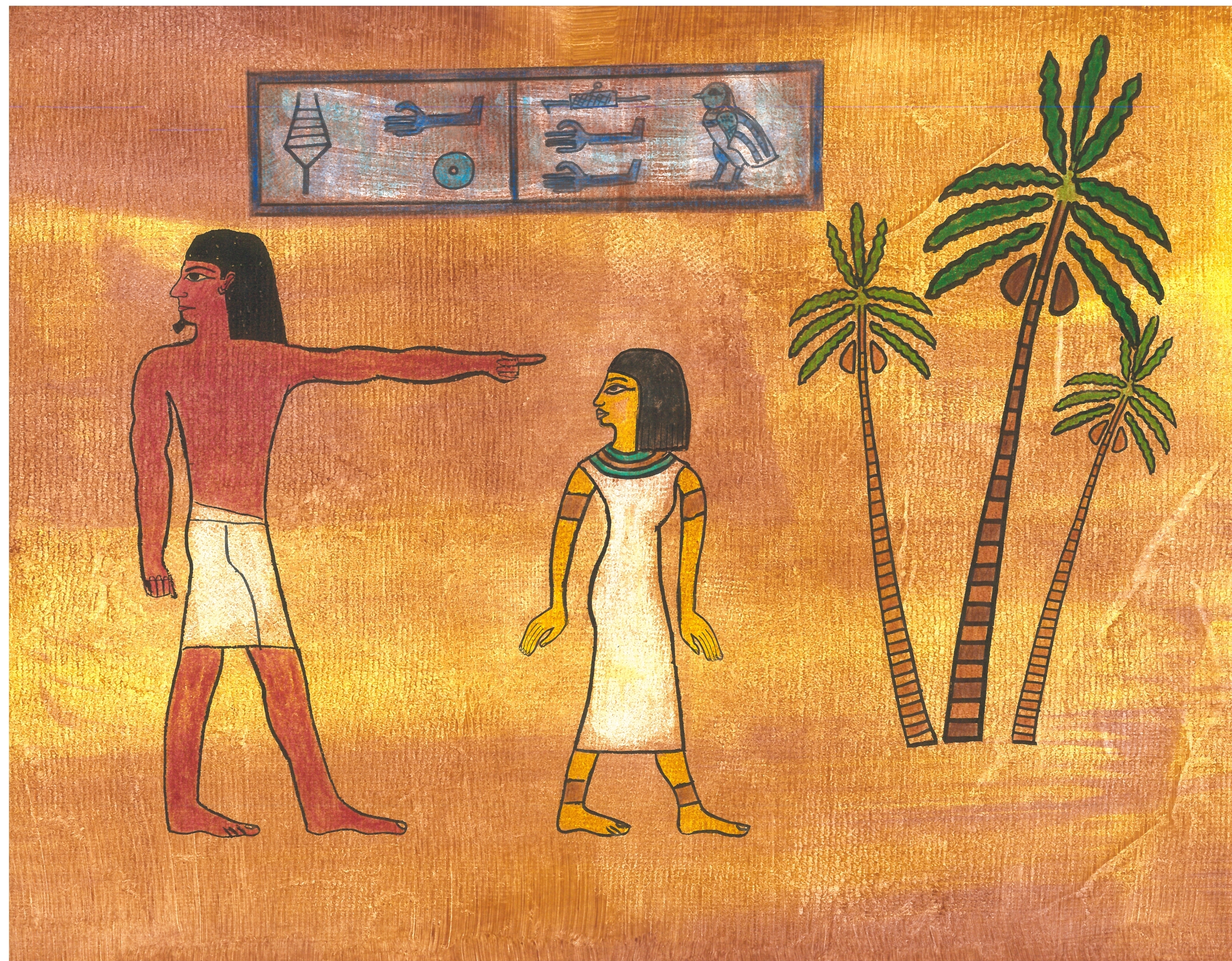 I illustrated the book in two-dimensional Egyptian style. I wanted the illustrations to look like ancient tomb paintings had come to life to tell the story. I used pencil crayon to replicate Egyptian colours and then covered the drawings with a tempera paint wash to mimic papyrus. I also researched authentic hieroglyphics to reinforce the text. Click on “Hieroglyphics” in the menu on this page to learn the meanings of the hieroglyphics found in the book.