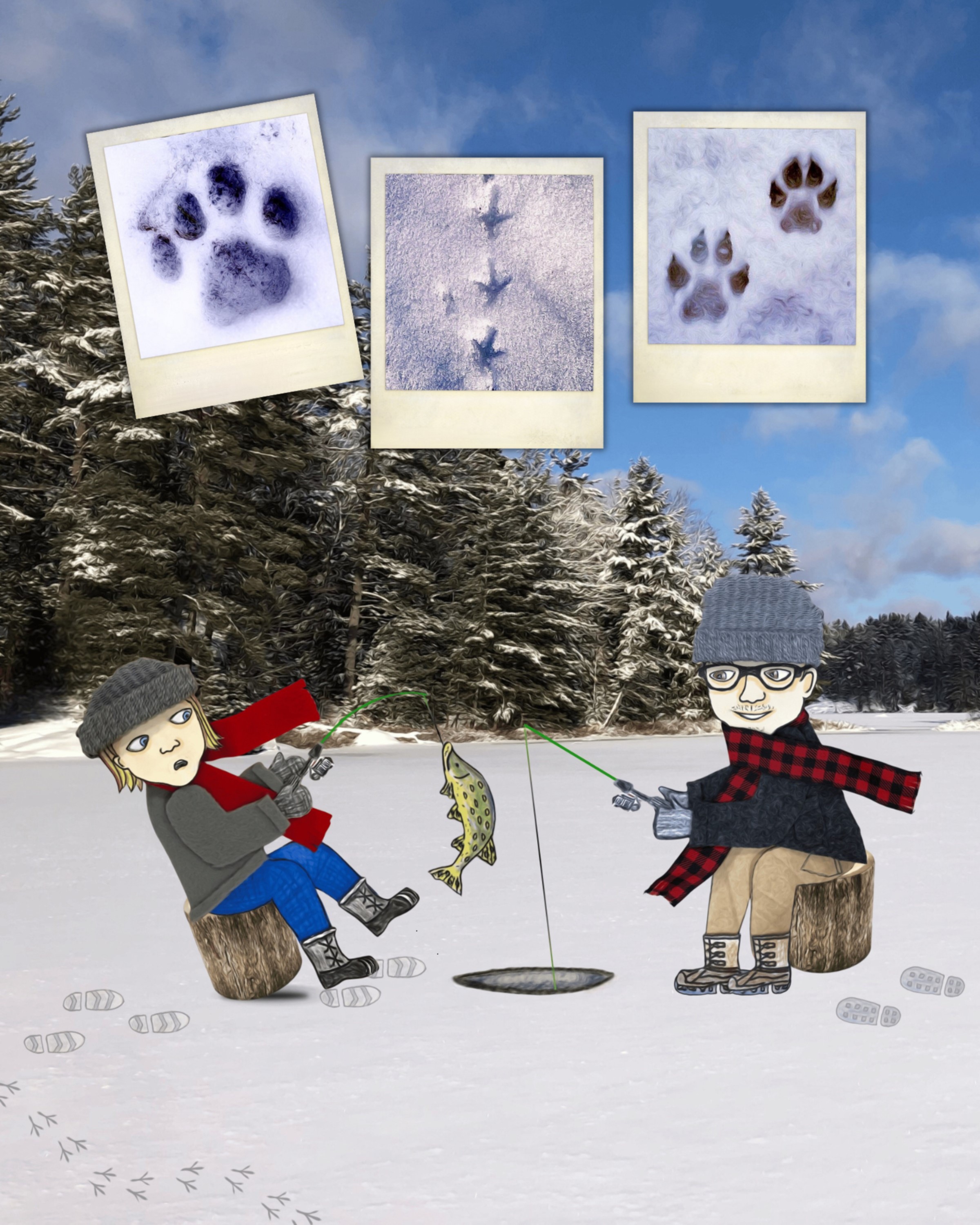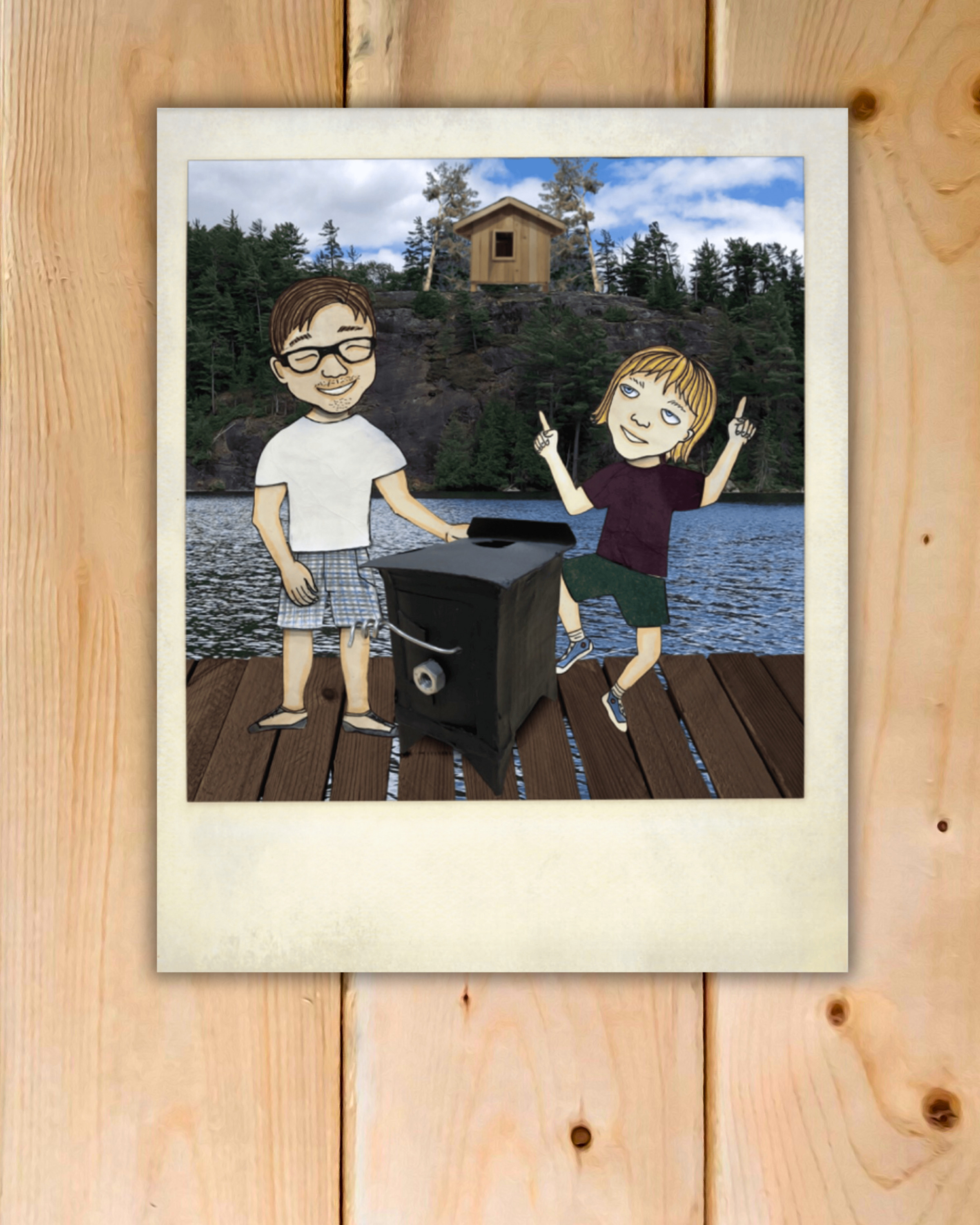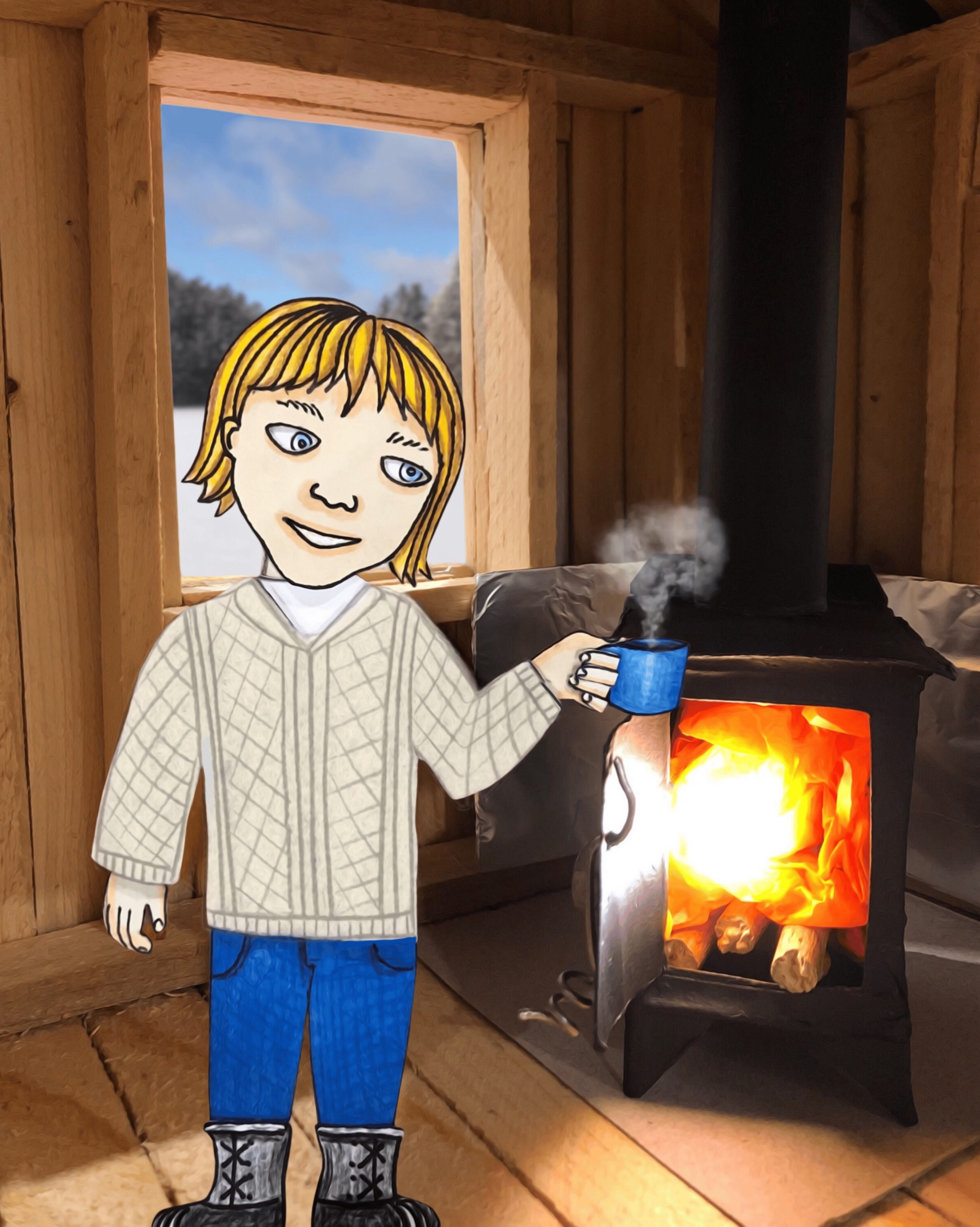 This story is based on my adventures, visiting our cabin in the winter. Thanks to our wood stove, the cabin is comfortable in cold weather. In the fall, we leave the cabin stocked with firewood, dried food and drinking water so we only need to carry in fresh food. If the lake isn’t frozen enough to walk on, we hike in through a forest trail. We love to look for animal tracks and have outdoor fires. My son loves to ice fish and take a cold plunge in the lake!